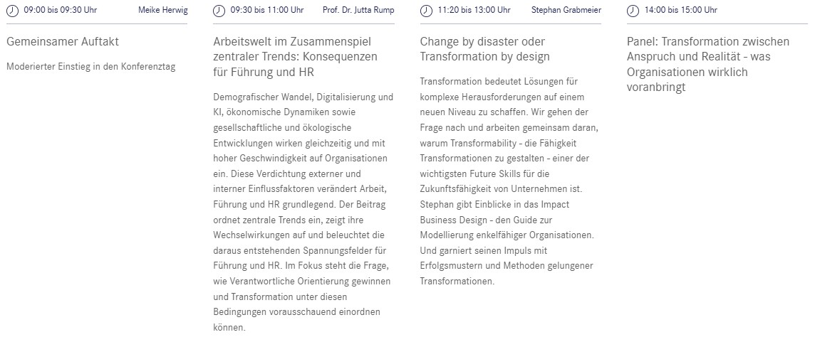 Die Konferenz richtet sich an HR-Verantwortliche und Führungskräfte, die Transformation aktuell mitverantworten, steuern oder begleiten und dabei mit widersprüchlichen Anforderungen konfrontiert sind. Angesprochen sind Personen, die Orientierung suchen, um Prioritäten klarer zu setzen, Position zu beziehen und Transformation intern überzeugend zu vertreten.