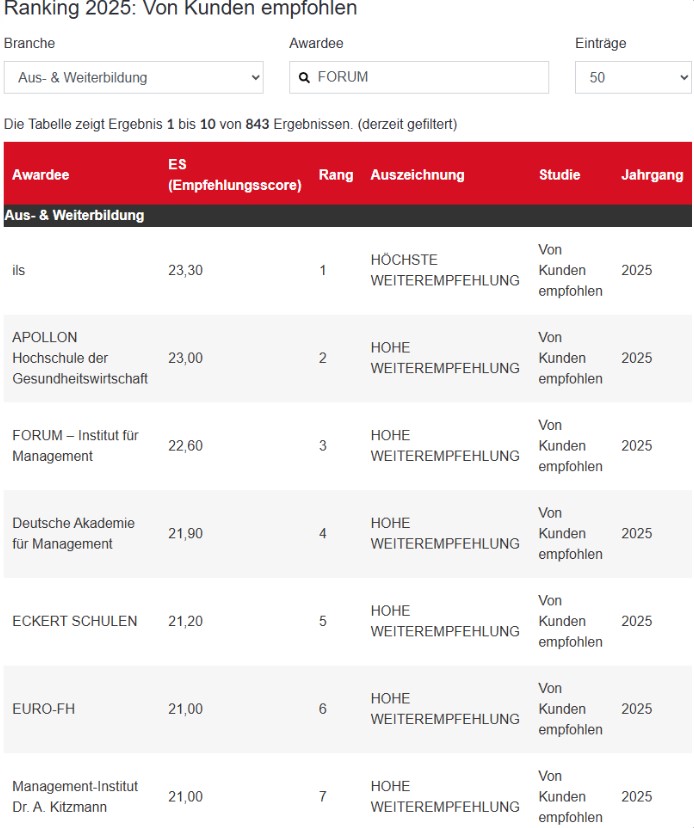 Dabei erneut vorne dabei: das FORUM Institut wird in der Branche „Aus- & Weiterbildung“ mit dem Prädikat Hohe Weiterempfehlung ausgezeichnet.