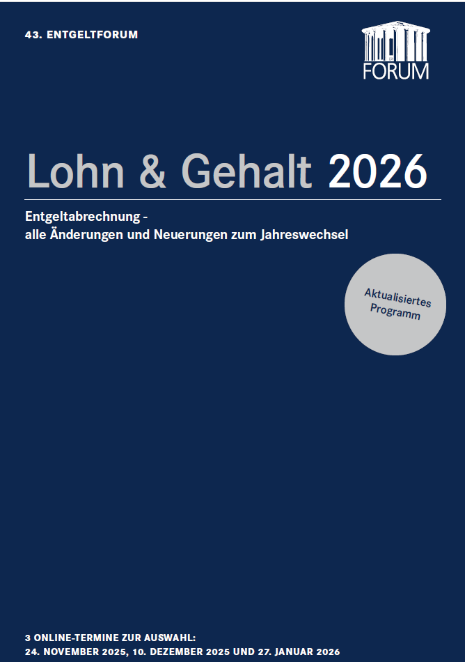 Hier können Sie sich gerne den Prospekt zum 43. EntgeltFORUM: Lohn & Gehalt 2026 herunterladen: