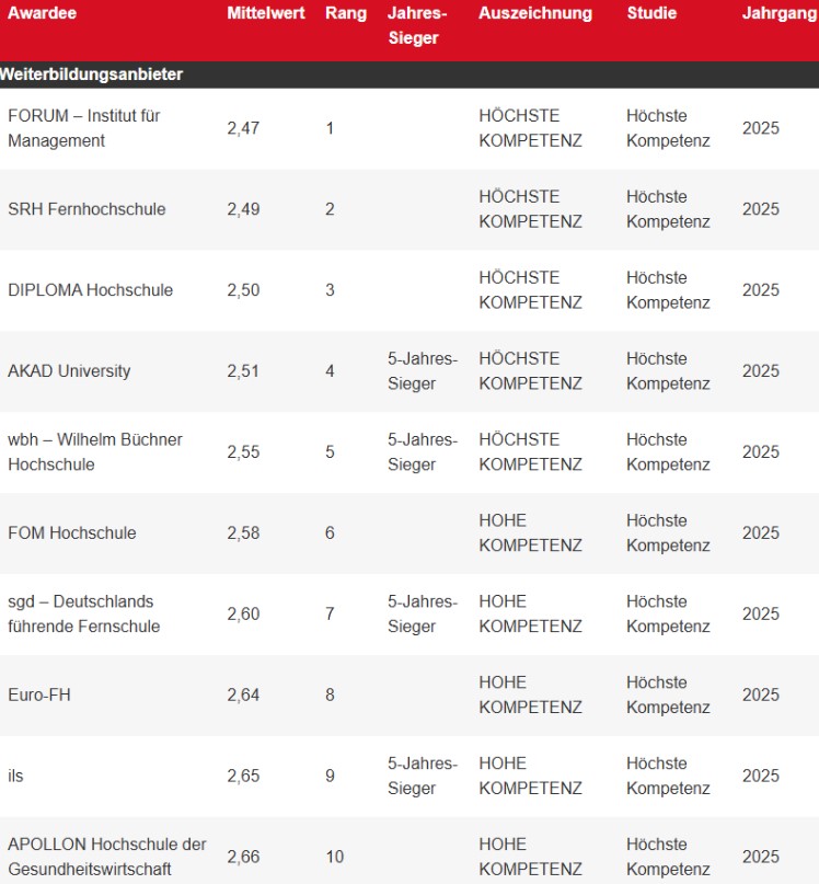 Dabei erneut vorne dabei: das FORUM Institut wird in der Branche „Aus- & Weiterbildung“ mit dem Prädikat Hohe Weiterempfehlung ausgezeichnet.