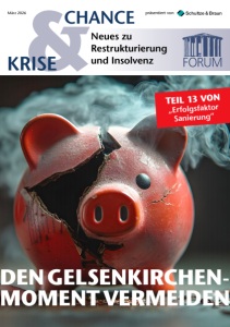 Am Aschermittwoch ist alles vorbei – so lautet der Titel des bekannten Karnevalslieds von Komponist Jupp Schmitz und Texter Hans Jonen. Aber keine Sorge, liebe Leserinnen und Leser: Auch wenn die fünfte Jahreszeit gerade zu Ende gegangen ist und wir uns – wenn diese Ausgabe erscheint – schon in der Fastenzeit befinden, müssen Sie nicht auf die wie immer gehaltvollen Themen von Krise & Chance verzichten – ganz im Gegenteil. Gleichwohl haben wir in dieser Ausgabe ein Titelthema, das durchaus etwas mit der Fastenzeit und dem damit verbundenen Verzicht zu tun hat. Denn Banken würden auf einen Ausfall ausgereichter Unternehmenskredite sicherlich gerne verzichten. Welche Möglichkeiten in diesem Zusammenhang das Konzept des Sanierungseigentümers eröffnet, zeigen Dr. Ludwig J. Weber und Dr. Dietmar Haffa von Schultze & Braun im Titelbeitrag „Den Gelsenkirchen-Moment vermeiden“. In zahlreichen Unternehmen stehen 2026 vom 1. März bis zum 31. Mai turnusgemäß Betriebsratswahlen an, unabhängig davon, ob sie wirtschaftlich auf Kurs sind, oder sie eine Restrukturierung oder sogar ein Insolvenzverfahren durchlaufen. Seraphim Ung Kim und Franz Orth von Schultze & Braun erläutern im Interview, worauf Restrukturierer, Sanierer und Insolvenzverwalter bei einer Betriebsratswahl, aber auch bei der Zusammenarbeit mit einem Betriebsrat achten sollten. Struktur und Systematik stehen auch im Mittelpunkt des Interviews zum IDW Standard 16 mit Guido Koch und Christoph Wehr von Schultze & Braun. Fünf Jahre nach Inkrafttreten des StaRUG werden mit dem neuen Standard die Anforderungen an Krisenfrüherkennung und Krisenmanagement weiter konkretisiert. Was das für Geschäftsleiter bedeutet und warum Prävention mehr ist als ein Schlagwort, ordnen Guido Koch und Christoph Wehr von Schultze & Braun für uns ein. Im 13. Teil unserer Serie „Erfolgsfaktor Sanierung“ steht dieses Mal eine im wahrsten Sinne des Wortes museumsreife Leistung im Fokus. Die SEIWO Technik GmbH ist bereits seit Jahrzehnten im Ausstellungs- und Bühnenbau eine feste Größe. Dass das Unternehmen aus dem Erzgebirge auch künftig am Markt aktiv sein kann, ist der engen und konsequent durchgehaltenen Zusammenarbeit von Insolvenzverwalter Dr. Dirk Herzig von Schultze & Braun und Geschäftsführer Dr. Jan Wabst, der gebotenen Beharrlichkeit bei der Akquise von neuen Aufträgen und Projekten und letztlich dem Investor aus den Niederlanden zu verdanken. Ich wünsche Ihnen eine anregende Lektüre. Ihr Tobias Hirte E D I T O R I A L