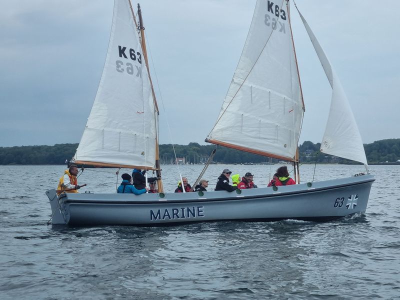 Am Nachmittag ging es dann zum ersten Training. Hier waren erstmal alle gleich, denn auch die Skipper hatten noch nie einen Marinekutter gesegelt und keine Ahnung, wie das Boot aufgeriggt werden muss. Mit tatkräftiger Hilfe der Soldatinnen und Soldaten der Marine klärten sich die offenen Fragen schnell und wir waren segelklar, legten unter Riemen ab, hissten die Segel und segelten durch den Marinehafen raus auf die Kieler Förde.